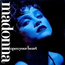 "Open Your Heart" is a song by American singer Madonna from her third studio album True Blue (1986). It was released as the album's fourth single in November 19, 1986 by Sire Records. It has since appeared remixed on the compilation albums The Immaculate Collection (1990) and Celebration (2009). Originally a rock and roll song titled "Follow Your Heart", it was written for singer Cyndi Lauper by songwriters Gardner Cole and Peter Rafelson, although it was never played to her. Since Madonna's management was looking for new songs for True Blue, she accepted it. Madonna altered some of the lyrics and changed the composition to suit the dance-pop genre, giving her a co-writer credit for the song. "Open Your Heart" is an innuendo-laden love song where Madonna expresses her sexual desire.