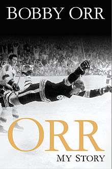 Orr: My Story is a 2013 autobiography written by Bobby Orr.[1] Orr is a former professional hockey player who played in the National Hockey League from 1966 to 1978. Orr played for two teams: the Boston Bruins and the Chicago Black Hawks. Considered one of the greatest players of all time, Orr's career was cut short by multiple knee injuries and surgeries. Orr was enshrined in the Hockey Hall of Fame in 1979 at age 31, the youngest to be inducted into the Hall at that time.[2][3] Orr is also known for being one of the first major sports figures to use an agent. Tragically, at the end of his career, Orr discovered that the agent, Alan Eagleson, had embezzled most of his money, leaving him deeply in debt.[4]