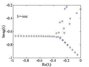 The first figure shows the spectrum of the Orr–Sommerfeld equation at the critical values listed above. This is a plot of the eigenvalues (in the form ) in the complex plane. The rightmost eigenvalue is the most unstable one. At the critical values of Reynolds number and wavenumber, the rightmost eigenvalue is exactly zero. For higher (lower) values of Reynolds number, the rightmost eigenvalue shifts into the positive (negative) half of the complex plane. Then, a fuller picture of the stability properties is given by a plot exhibiting the functional dependence of this eigenvalue; this is shown in the second figure.