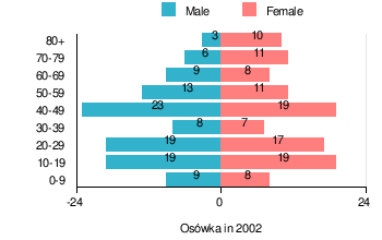 According to the 2002 Poland census, there were 219 people residing in Osówka village, of whom 49.8% were male and 50.2% were female. In the village, the population was spread out with 20.5% under the age of 18, 37% from 18 to 44, 23.3% from 45 to 64, and 19.2% who were 65 years of age or older.[1]