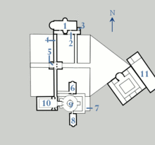 The geometry of the plan chosen was very simple: Odo of Metz decided to keep the layout of the Roman roads and inscribe the square in 360 Carolingian feet, or 120 metres-side square.[14][15] The square enclosed an area of 50 acres[16] divided in four parts by a North-South axis (the stone gallery) and an East-West axis (the former Roman road, the decumanus). To the north of this square lay the council hall, to the south the Palatine Chapel. The architect drew a triangle toward the East to connect the thermae to the palace complex. The two best-known buildings are the council hall (today disappeared) and the Palatine Chapel, included into the Cathedral. The other buildings are hardly identified.[17] Often built in timber framing, made of wood and brick, they have been destroyed. Lastly, the palace complex was surrounded with a wall.[18]
