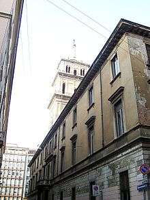 The palace was commissioned by Massimiliano Stampa, marchese di Soncino from the architect Cristoforo Lombardo (died circa 1550). The three story palace encompasses the entire block; the facade, on a narrow street, is dominated by a central five story square-plan tower, arising from the courtyard. Further additions and enlargements were pursued over the centuries since the original construction.[1] The shield on the tower has the imperial House of Habsburg eagle, singling the support given by Stampa to the rule of Milan by Charles V, Holy Roman Emperor.[2]