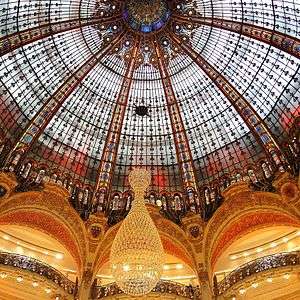 Gas lighting and early electric lighting presented serious dangers of fire for early department stores; architects of the new stores used huge ornamental glass skylights whenever possible to fill the stores with natural iight, and designed the balconies around the central courts to provide the maximum of light to each section. The Galeries Lafayette store on Boulevard Haussmann, finished in 1912, combined skylights over courtyards with balconies with undulating railings, which gave the interiors the rich roccoco effect of a baroque palace. Before the store was enlarged and modernized, it had several vertical great halls filled with light from richly-decorated glass cupolas. [14]