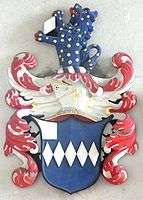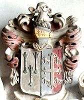 The heraldic achievement atop the Risdon mural monument shows the arms as: Argent, three bird-bolts sable (Risdon) impaling Party per pale azure and purpure, a cross flory or between four lambs argent each gorged with a rope pendant azure[12] (arms of Mary Isack, daughter of Francis Isack (1589-1658) of Barnstaple and Aylescott,[13] West Down, Devon, (whose mural monument with effigy survives in St Calixtus Church, West Down) by his wife Grace Roberts, and wife of William Risdon).[14] The crest of Risdon above is: An elephant's head erased ermine eared and armed or.[15]