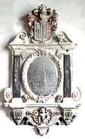 During the rebuilding of the church in 1862 by Mark Rolle, the monument was moved from its original position of great honour in the chancel within the altar rails,[8] and was replaced against the south wall of the tower. Two female figures forming part of the composition were accidentally destroyed during the move, having crumbled upon being dislodged.[9] It was reported by Hoskins in 1954 to be "now pushed into the tower and dirty and neglected".[10] In 1987 it was restored, repainted and repositioned in the south aisle in the newly created chapel enclosure financed by a bequest from the parishioner Mary Withecombe. The Latin text of the monument is as follows: