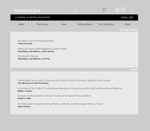 Parrhesia: A Journal of Critical Philosophy is an international journal of Critical Philosophy affiliated with MSCP. It is edited by four MSCP members: Alex Murray, Matthew Sharpe, Jon Roffe and Ashley Woodward.[7][8] It was launched in 2006 and has included articles by Alain Badiou[9][10] and Jacques Rancière.[11]