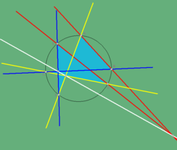 In projective geometry, Pascal's theorem (also known as the Hexagrammum Mysticum Theorem) states that if six arbitrary points are chosen on a conic (i.e., ellipse, parabola or hyperbola) and joined by line segments in any order to form a hexagon, then the three pairs of opposite sides of the hexagon (extended if necessary) meet in three points which lie on a straight line, called the Pascal line of the hexagon.