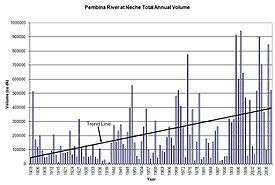 Water flow rates in the Pembina River watershed are highly variable. Data from hydrometric stations are used to monitor river flow rates and lake levels, for flood forecasting, and water management investigations. Water levels typically peak during spring run-off and rapidly declines generally in a few days. Groundwater contribution to stream flow normally ensures the river runs throughout the year. The months of March, April and May account for 68 percent of the run-off in a given year. Annual spring run-off rates are highly variable. In Neche, ND the lowest annual volume recorded was 356-m (2870 acre-ft) in 1939. The highest recorded volume was 94,400 hectare-m (765,000 acre-ft) in 1997.[5]