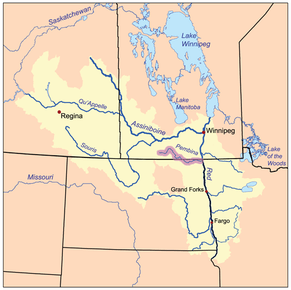 The Pembina River is a tributary of the Red River of the North, approximately 319 miles (513 km) long,[3] in southern Manitoba in Canada and northeastern North Dakota in the United States. It drains an area (about 8500 square kilometers) of the prairie country along the Canada–US border, threading the Manitoba-North Dakota border eastward to the Red River. Via the Red River, Lake Winnipeg and the Nelson River, it is part of the watershed of Hudson Bay.