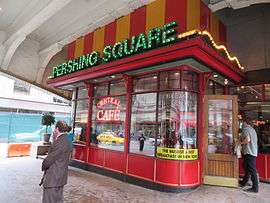 The square is named after General John J. Pershing, and was originally intended to be an open plaza in Pershing's honor; plans for this were first circulated in 1919.[1] In 1920, some of the land that had been intended to be Pershing Square was sold to a real estate development company, which put up an office building called the Pershing Square Building, completed in 1923. As a result, "Pershing Square" now refers to the area immediately under and around the viaduct.[1]