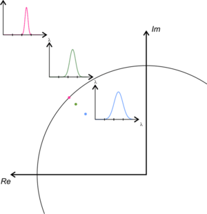 In Fluorescence lifetime and spectral imaging, phasor can be used to visualize the spectra and decay curves.[1][2] In this method the Fourier transformation of the spectrum or decay curve is calculated and the resulted complex number is plotted on a 2D plot where the X axis represents the Real component and the Y axis represents the Imaginary component. This facilitate the analysis since each spectrum and decay is transformed into a unique position on the phasor plot which depends on its spectral width or emission maximum or to its average lifetime. The most important feature of this analysis is that it is fast and it provides a graphical representation of the measured curve.