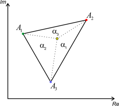 For a system which has three different components and they show different spectra, the phasor of the pixeles with different fractional intensities fall inside a triangle where the verti are made up by phasor of pure components. The fractional intensities then can be estimated by measuring the area of the triangle that each phasor makes with the phasor of pure vertix.