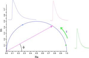 This is a complex function and drawing the Imaginary versus real part of this function for all possible lifetimes will be a semicircle where the zero lifetime is located at (1,0) and the infinite lifetime located at (0,0). By changing the lifetime from zero to infinity the phasor point moves along a semicircle from (1,0) to (0,0). This suggest that by taking the Fourier transformation of a measured decay curve and mapping the result on the phasor plot the lifetime can be estimated from the position of the phasor on the semicircle.