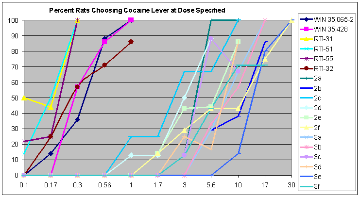 All of the tables and graphs shown beneath is from an article published by FIC, et al. 2004.[18] In summary the following observations can be made: Troparil, WIN35428 and RTI-32 are insufficiently potent. This observation is mainly based on the fact that at 100 mg/kg both troparil and WIN35428 produces convulsions. The twist-boat isomers are insufficiently potent in all cases. The trans isomers (alpha,beta) are too weak and might actually be dangerous and cause death. RTI-55, while highly potent, still causes death at a dose of 100 mg/kg. It is advised to consider RTI-229. RTI-31 is the most potent isomers for the DAT and was "safe" (on a relative scale) even in the event of overdose at 100 mg/kg. RTI-51 also looks like a "good" compound, although its synthesis is slightly more difficult than for RTI-31. RTI-51 is less selective for the DAT than RTI-31 and has appreciable SERT affinity also.
