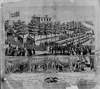 In June 1864, the Philadelphia division of the United States Sanitary Commission organized a large fair to raise money to buy bandages and medicine. The Great Central Fair lasted two weeks, and was held in temporary buildings covering several acres of Logan Square. Thousands of works of art were lent for display, many donated for auction. Among the visitors was President Lincoln.[9] The Sanitary Fair raised $1,046,859.[10]