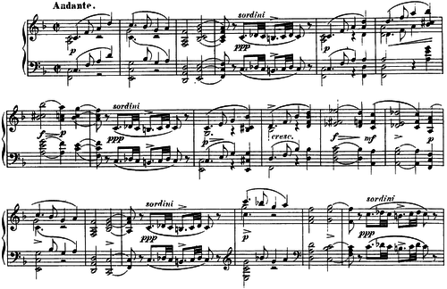 (with an accented first note), plays a very important role throughout the movement, both in its accentuation (on the downbeat) and its rhythm (abruptly breaking off on a short note).[3] The proliferation of this motive means that rhythm is of key importance for a pianist to maintain coherence throughout the movement.[2] Melodically, the first subject is based around the resolution of the dissonance D♯–E (♯