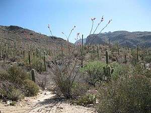 Pima Canyon, which is called a desert riparian habitat, has good opportunities for birdwatching. Many desert creatures can be seen, the larger of which are jackrabbits, javelina, and desert bighorn sheep. Because of its proximity to the Tucson metropolitan area, Pima Canyon is described as "overused", especially during the mild local winters.[1] Many varieties of desert plants can be seen along the trail including the ocotillo, prickly pear, palo verde, mesquite, and the ubiquitous saguaro.