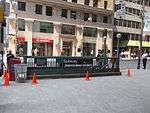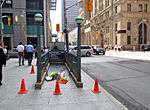 On March 25, 2014, the Ontario Media Development Corporation confirmed that the film would be shot in Toronto from May 28 to September 9 at Pinewood Toronto Studios.[28][29] Principal photography on the film commenced in Toronto, Ontario on June 2, 2014, using downtown streets decorated to resemble New York City.[30] Given sequences such as the Pac-Man chase happened at night, often the filmmakers would close the streets off from traffic at 7 PM, and redecorate to resemble New York until it was dark enough, filming from 9:30 PM up to 5:30 AM.[31] On July 29, filming was taking place outside of Markham, Ontario.[32] Filming was also done in the Rouge Park area, and extras were dressing in costume at Markham's Rouge Valley Mennonite Church.[32] On August 4, actors Josh Gad, Peter Dinklage and Ashley Benson were spotted in Toronto filming scenes for the film on Bay Street, which was transformed into a city block in Washington, D.C., and littered with wrecked vehicles and giant holes in the pavement.[33] The Ontario Government Buildings was doubled to transform into a federal office building in Washington. Actors were aiming at aliens, which could not be seen, but were added later with CGI.[33]