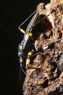 Platymeris biguttatus or Two-spotted assassin bug is a venomous predatory true bug of west and southwest African origin ranging in size from 10–40 mm.[1] As a true bug of the order hemiptera, it has needle like mouth parts designed for sucking juices out of plants or other insects instead of chewing. P. biguttatus has sharp stylets in its proboscis or rostrum used to pierce the exoskeleton of its prey. Saliva is then injected into the prey which liquifies its tissues,and the rostrum is then used to suck out the digested fluids. If disturbed, it is capable of a defensive bite considered to be more painful than a bee sting.[2] It is also known to spit venom that can cause temporary blindness in humans.