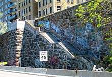 The now disused staircase leading down from the viewing area to what was once Riverside Drive, but is now the northbound lanes of the Henry Hudson Parkway- Just north of the Plaza is a pedestrian bridge over the parkway to the Hudson River Greenway; this image was taken from the Greenway - in the background is Castle Village, a cooperative apartment complex.