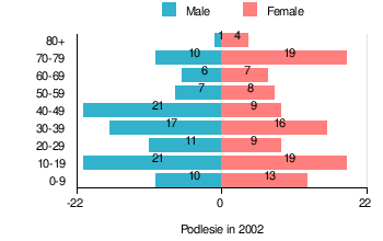 According to the 2002 Poland census, there were 208 people residing in Podlesie village, of whom 50% were male and 50% were female. In the village, the population was spread out with 25% under the age of 18, 39.9% from 18 to 44, 13.9% from 45 to 64, and 21.2% who were 65 years of age or older.[1]