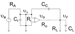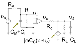 - ↑ The expression for differs a little from ( CM+Ci ) ( RA // Ri ) as found initially for f1, but the difference is minor assuming the load capacitance is not so large that it controls the low frequency response instead of the Miller capacitance.