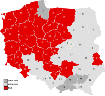 | Voivodeships with winning majority ■ – Solidarity Electoral Action ■ – Democratic Left Alliance *As the sum of the UW's constituent parties, the Democratic Union and the Liberal Democratic Congress. | |||||||||||||||||||||||||||||||||||||||||||||||||||||||||||||||||||||||||||||||||||||||||||||||||||||||||||||||||||||||||||||||||||||||||||||||||||||||||||