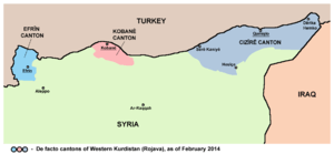 Rojava (IPA: [roʒɑːˈvɑ], "the West") is a de facto autonomous region originating in and consisting of three self-governing cantons in northern Syria,[12] namely Afrin Canton, Jazira Canton and Kobanî Canton, as well as Shahba region.[13] The region gained its de facto autonomy as part of the ongoing Rojava conflict and the wider Syrian Civil War, establishing and gradually expanding a secular polity[14][15] based on the Democratic Confederalism principles of democratic socialism, gender equality, and sustainability.[3][4][12][16]