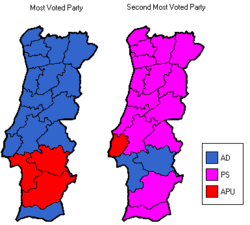 | A Alliance formed by the Social Democratic Party (73 seats), the Democratic and Social Centre (43 seats) and the People's Monarchist Party (5 seats). B Social Democratic Party and Democratic and Social Centre electoral list only in Azores and Madeira. C Portuguese Communist Party (44 MPs) and Portuguese Democratic Movement (3 MPs) ran in coalition.[3] | ||||||||||