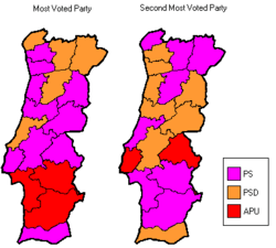 | The first and the second most voted parties in each district (Azores and Madeira are not shown) | |||||||||||||||||||||||||||||||||||||||||||||||