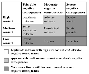 The work by Warkentins et al. (described in Section 7.3.1 in (Boldt 2007a)) can be used as a starting point when developing a classification of privacy-invasive software, where we classify privacy-invasive software as a combination between user consent and direct negative consequences. User consent is specified as either low, medium or high, while the degree of direct negative consequences span between tolerable, moderate, and severe. This classification allows us to first make a distinction between legitimate software and spyware, and secondly between spyware and malicious software. All software that has a low user consent, or which impairs severe direct negative consequences should be regarded as malware. While, on the other hand, any software that has high user consent, and which results in tolerable direct negative consequences should be regarded as legitimate software. By this follows that spyware constitutes the remaining group of software, i.e. those that have medium user consent or which impair moderate direct negative consequences. This classification is described in further detail in Chapter 7 in (Boldt 2007a).