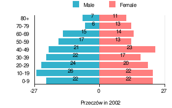 (by age group in 2002)TOTAL 0-9 10-19 20-29 30-39 40-49 50-59 60-69 70-79 80 + I. TOTAL person 315 44 48 44 39 44 30 29 19 18 — of which in % 100 14 15.2 14 12.4 14 9.5 9.2 6 5.7 1. BY SEX A. Males person 160 22 26 24 22 21 17 15 6 7 — of which in % 50.8 7 8.3 7.6 7 6.7 5.4 4.8 1.9 2.2 B. Females person 155 22 22 20 17 23 13 14 13 11 — of which in % 49.2 7 7 6.3 5.4 7.3 4.1 4.4 4.1 3.5