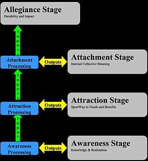 In the attachment stage the benefits and the sport object are internalised taking on a collective emotional, functional, and symbolic meaning.[12] The psychological connection towards a sport, event, team or leisure hobby strengthens. Internal processes become more important and the influence of socializing agents decreases. Examples for the attachment stage are I am a football player or I am a Liverpool Fan.
