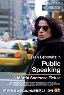 Public Speaking is a 2010 HBO documentary film directed by Martin Scorsese, about the American author Fran Lebowitz, containing interviews and clips from speaking engagements.[1][2][3]