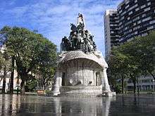 The monuments and public works of art can be classified in several types: until the 19th century the most used were the column, the arch of triumph and the equestrian statue, three types of memorial monuments inherited from Roman art. Later they would be arising several modes, since the sculpture placed or the situated in niches, going through busts, medallions, sources, steles and pedestals, friezes, reliefs, plates, gravestones and other elements, until varieties more modern like installations, integrated works to the nature (land art), works realised with new technologies (video, laser) or any mode conceived with multidisciplinary elements.[7]