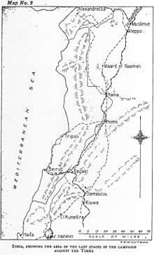 On 5 October the advance north was resumed although supply would be difficult.[38] Allenby anticipated capturing the ports of Beirut and Tripoli, which would improve supplying rations to Desert Mounted Corps. "Nevertheless his decision [to continue the pursuit] was born of rare ambition and resolution."[39] It would be a "bold move" as the British Empire troops would be well beyond range of support from the rest of the EEF.[40]