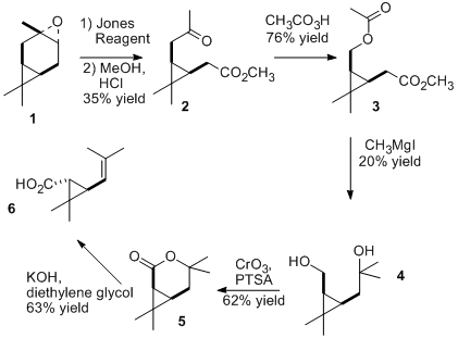 - ↑ Sobti, R., Dev, S. (1974). "(+)-TRANS-CHRYSANTHEMIC ACID FROM (+)-Δ3-Carene". Tetrahedron. 30 (16): 2927–2929. doi:10.1016/S0040-4020(01)97467-8.