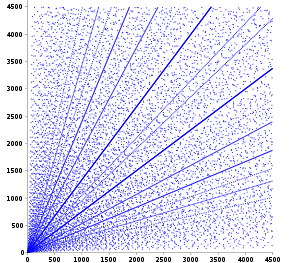 Note, for example, that (6, 8, 10) is not a primitive Pythagorean triple, as it is a multiple of (3, 4, 5). Each of these low-c points forms one of the more easily recognizable radiating lines in the scatter plot.