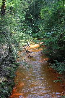 Quaker Run has a thick layering of iron precipitate along its length. The layering is more thick and solidly packed than in some other nearby streams.[3] Historically, there was a quarry near the stream.[10] Mine complexes also extend under the stream.[4]
