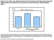 The infant mortality rate for African Americans is approximately twice the rate for European Americans, but, in a study that looked at members of these two groups who belonged to the military and received care through the same medical system, their infant mortality rates were essentially equivalent.[45] Recent immigrants to the United States from Mexico have better indicators on some measures of health than do Mexican Americans who are more assimilated into American culture.[46] Diabetes and obesity are more common among Native Americans living on U.S. reservations than among those living outside reservations.[47]