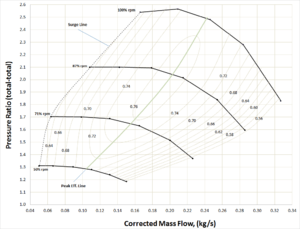 The surge-line shown in Figure 5.2 is the curve that passes through the lowest flow points of each of the four speed lines. As a test map, these points would be the lowest flow points possible to record a stable reading within the test facility/rig. In many industrial applications it may be necessary to increase the stall line due to the system backpressure. For example, at 100% RPM stalling flow might increase from approximately 0.170 kg/s to 0.215 kg/s because of the positive slope of the pressure ratio curve.