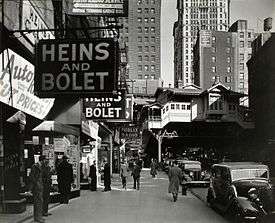 In 1930, the Times described Radio Row as located on Greenwich Street "where Cortlandt Street intersects it and the Ninth Avenue Elevated forms a canopy over the roadway.... The largest concentration is in the block bounded by Dey Street on the north and Cortlandt on the south, but Radio Row does not stop there; it overflows around the corner, around several corners, embracing in all some five crowded blocks." It estimated 40 or 50 stores in the vicinity, "all going full blast at the same time. There may be regulations prohibiting this vociferous practice, but if the radio dealers have anything to say it about it, it will never have the slightest effect along Radio Row.... The clamor is heard even as one walks through the subway tunnel to the street exit.... The first impression, and in fact the only one, is auditory, a reverberating bedlam, a confusion of sounds which only an army of loudspeakers could produce." It noted, in addition to merchants selling radio sets, "others display mostly accessories... one shopkeeper last week featured a crystal set small enough to fit into a pocket, and another gave prominent position to a bucket of condensers about an inch in side."[5]