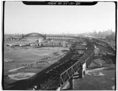 In 1937, the islands were connected by a bridge over Little Hell Gate, obviating the need for a ferry to Wards Island.[36] In fact, there were two bridges that appear to have been known as Little Hell Gate Bridge – an early 20th-century rail bridge on the approach to Hell Gate Bridge, and a later, lower steel arch road bridge across Little Hell Gate. The northern approach viaduct to the Hell Gate Bridge included an inverted bowstring truss bridge, with four 300-foot (91 m) long spans, across Little Hell Gate.[37]
