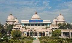 Rangeeli Mahal, founded in 1996, is one of the main centers of Jagadguru Kripalu Parishat, is located at Shri Radharani’s eternal abode, Barsana. In describing the glory of Barsana dham, Shri Maharaj Ji had said that within this Barsana dham resides the Divine Barsana dham. In Rangeeli Mahal, there is a large satsang hall with depictions of Shri Radha Krishna’s pastimes all around the hall. There are also beautifully landscaped gardens, waterfalls and other attractions.[1]