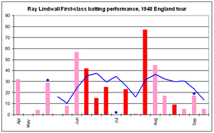 The local batsmen were unable to cope with Lindwalls high pace and swing; 43 of his wickets came after his opponent had missed the ball and been bowled.[3] Lindwall scored 411 runs at 24.17 with two fifties in the first-class matches, including 191 at 31.83 in the Tests.[120] Lindwall had limited batting opportunities, usually playing from No. 7 to No. 9.[13] It was hard for Lindwall to get any higher up the order as Australia's other frontline bowlers, such as Colin McCool, Ian Johnson and Doug Ring, all scored centuries and more than 20 fifties each during their first-class career, and were of similar batting ability.[128] As Australia often won by an innings, and declared in the first innings on many occasions due to their batting strength, Lindwall only had 20 innings in his 22 matches, and usually batted at Nos. 7, 8 and 9.N-[1] However, he was often effective when he did get an opportunity.[13][129]