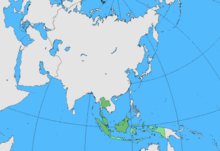 The red-naped trogon is presumed to be a permanent resident or sedentary bird. Sedentary is “commonly used in the special sense of ‘non-migratory,’” and resident is defined as “remaining throughout the year in the area under reference”.[9] At least 4,000 species of bird are regular migrants, which is approximately 40 percentage of the world’s population of birds,[10] however the red-napped trogon is not one of these. It does not migrate, but instead remains in the same location all year round. Red-naped trogons are confined to the Sundaic regions lowlands, also known as Sundaland, with a distribution size of 989,000 km². The Sundaic lowlands is a biogeographical region of South-eastern Asia which encompasses the Sunda shelf, Malay Peninsula of the Asian mainland, and the large islands of Borneo, Java and Sumatra, including their surrounding islands. The eastern boundary of the Sundaic region is the Wallace Line which separates the Indomalaya and Australasia ecotones.