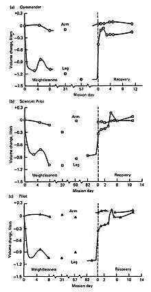 The studies completed during Apollo, although less than optimal, left no doubt that a decrement in exercise tolerance occurred in the period immediately after landing, although it is believed that such decrements were not present during surface EVA. It seems likely that multiple factors are responsible for the observed decrements. Lack of sufficient exercise and development of muscle disuse atrophy probably contributed. Catabolic tissue processes may have been accentuated by increased cortisol secretion as a consequence of mission stress and individual crew member reaction to such stress. Additional factors associated with the return to Earth's gravity may also be implicated. This, the observed diminished stroke volume (cardiac output) is certainly contributory and, in turn, is a reflection of diminished venous return and contracted effective circulating blood volume induced by spaceflight factors.[9] Skeletal muscle atrophy is mentioned with respect to its possible contribution to exercise intolerance, and in some of the later Apollo flights lower limb girth measurements were completed (data not published) that provided the first evidence for loss of muscle mass in the legs.