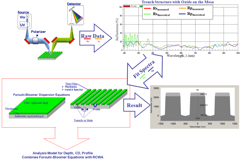 The Forouhi-Bloomer dispersion equations in combination with Rigorous Coupled-Wave Analysis (RCWA) have also been used to obtain detailed profile information (depth, CD, sidewall angle) of trench structures. In order to extract structure information, polarized broadband reflectance data, Rs and Rp, must be collected over a large wavelength range from a periodic structure (grating), and then analyzed with a model that incorporates Forouhi-Bloomer dispersion equations and RCWA. Inputs into the model include grating pitch and n and k spectra of all materials within the structure, while outputs can include Depth, CDs at multiple locations, and even sidewall angle. The n and k spectra of such materials can be obtained in accordance with the methodology described in this section for thin film measurements.