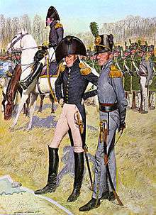![]() Riflemen officer in gray (foreground) and troops in green smocks (background) | |