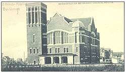 Knox-Metropolitan United Church is the current manifestation of Presbyterian and Methodist congregations that date back to 1885. "The original Knox Church was constructed in 1885 at Scarth Street and 11th Avenue. The Presbyterian congregation sold the site to the Dominion Government for their new post office and erected a new Knox Presbyterian Church at 12th Avenue and Lorne Street in 1905."[56] Knox and Metropolitan churches were destroyed by the "Cyclone"; both were soon rebuilt. Knox Presbyterian, on 12th Avenue across from Victoria Park on the north side, was next door to the YMCA. Both were destroyed by the Regina Cyclone of 1912 and immediately rebuilt. In 1951 the two congregations of the now-United Church of Canada merged and occupied the Metropolitan building with Knox being demolished. Many of Knox's congregation had dissented from the 1925 church union, wishing to remain Presbyterian rather than become United Church, and adjourned to the new First (non-concurring or continuing) Presbyterian Church on Albert Street, built in 1926; more members of Knox's congregation had relocated to the new post-World War II residential subdivision of Lakeview, south of Wascana Creek and west of Albert Street, and when Knox United was demolished its impressive pipe organ was moved to Lakeview United Church. Knox-Met is the major venue for downtown choral concerts, organ recitals and the annual Kiwanis Carol Festival.